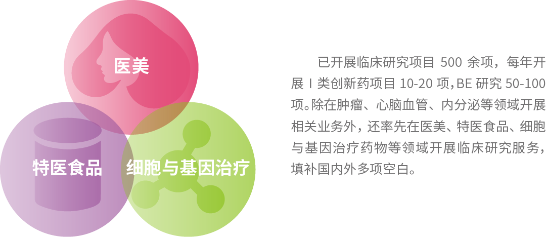已為500余家國內外知名企業提供多元化的研發支持臨床技術服務,包括化藥、中藥、生物藥的創新藥/仿制藥臨床試驗、仿制藥生物等效性(BE)試驗及藥代動力學(PK/PD)臨床研究、體內外相關性研究(IVIVR)、醫學方案設計及指導、第三方稽查服務及項目投融資等,全面覆蓋大小分子藥物、滿足不同研發型企業的臨床研究定制需求,為國內外客戶打通新藥上市前關鍵瓶頸。