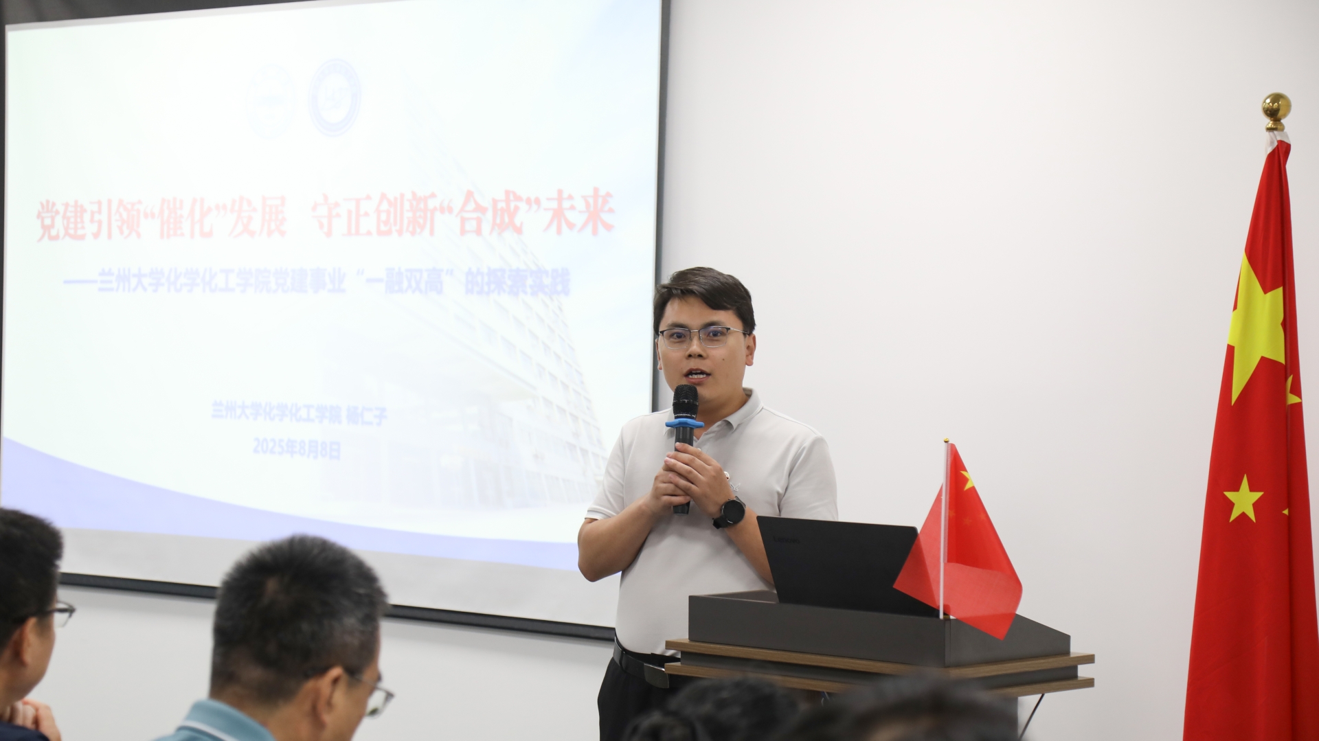 蘭州大學化學化工學院黨委副書記楊仁子帶來《黨建引領“催化”發展,守正創新“合成”未來》分享。他以化學領域的“催化”“合成”等專業概念為喻,探討了黨建工作中如何將黨組織的政治優勢轉化為人才培養、學科發展動力的關鍵議題。