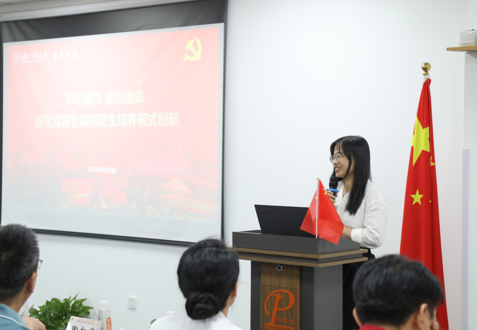北師大樂育書院明德苑舍師生聯合黨支部書記曹美新針對《黨建引領下的師范生培養創新路徑探索》展開講解,樂育學院堅持為國育才,落實習近平總書記“回信精神”,聚焦“三全育人”抓黨建,引領了師范報國新風尚。
