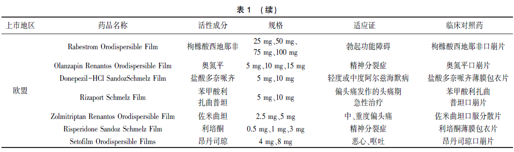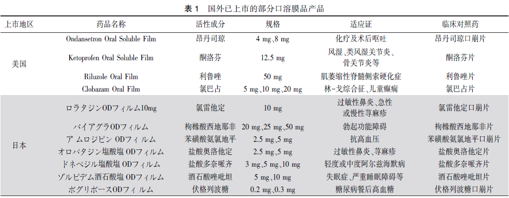 2006年,日本上市了第一個口溶膜處方藥伏格列波糖口溶膜。2010年,美國和歐洲分別上市第一個口溶膜處方藥昂丹司瓊口溶膜(Rapidfilm和Setofilm)。2020年,國家藥品監督管理局批準了第一個口溶膜化學藥品奧氮平口溶膜上市。目前,全球已有多個口溶膜產品上市,查詢美國、歐洲、日本藥品監管機構網站,部分品種信息見表1。