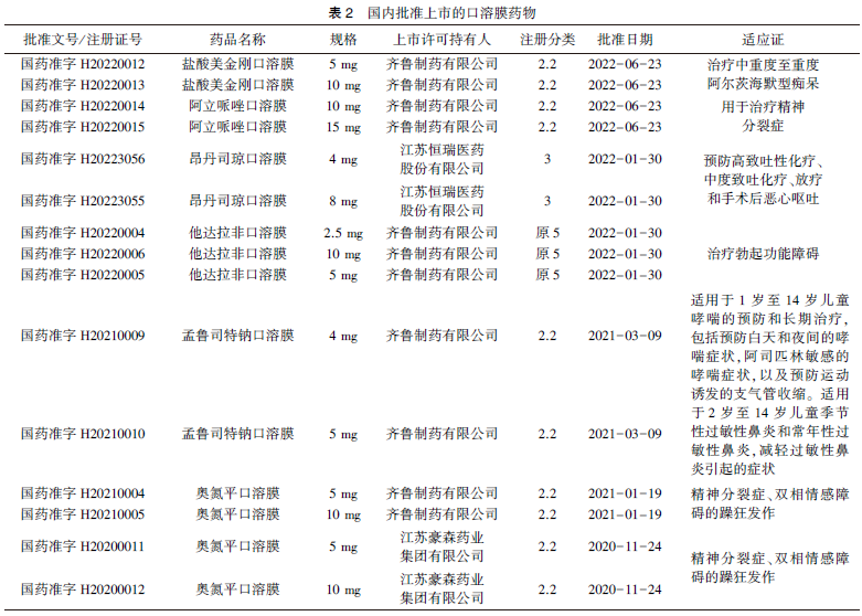 通過國家藥品監督管理局網站查詢,統計了我國批準的口溶膜藥物(見表2),共15個批準文號,按照注冊分類統計,其中10個為2.2類改良型新藥,占大多數;按適應證統計,其中6個為精神障礙疾病藥物、3個為生殖系統疾病藥物、2個為精神神經系統藥物、2個為呼吸系統疾病及抗過敏藥物、2個消化道及代謝藥物。
