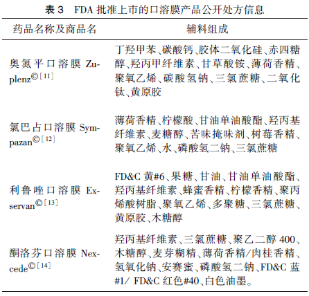 調研美國食品藥品監督管理局(Food and Drug Administration,FDA)批準上市的口溶膜處方如表3所示。其中羥丙甲纖維素、羥丙基纖維素為常用的成膜材料,甘油、甘油單油酸酯為常用的增塑劑,三氯蔗糖、香精為常用的矯味劑。