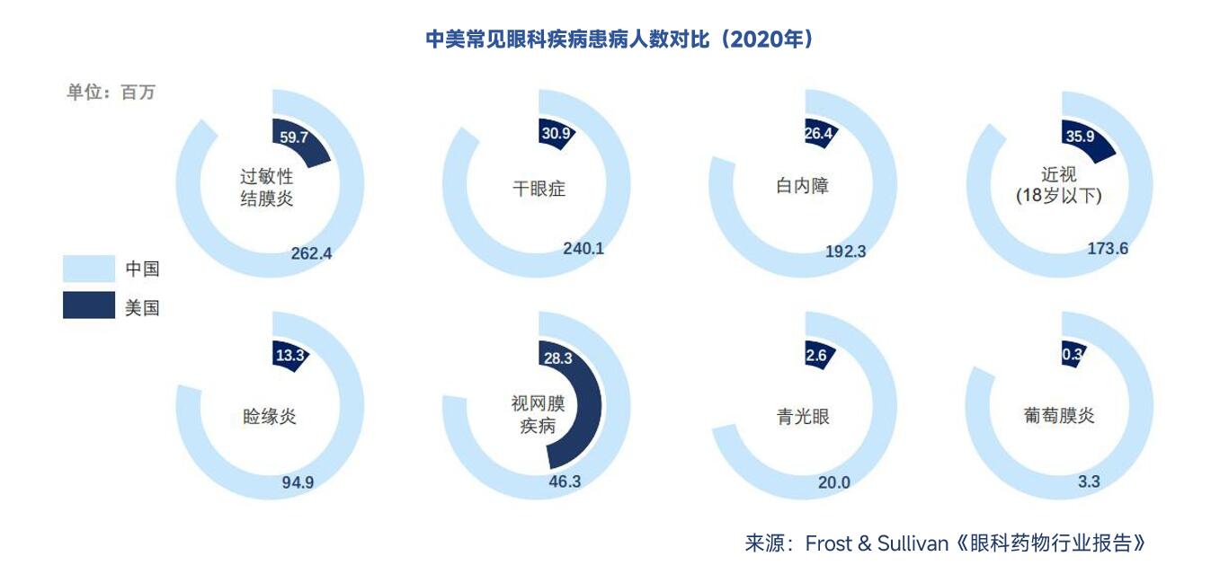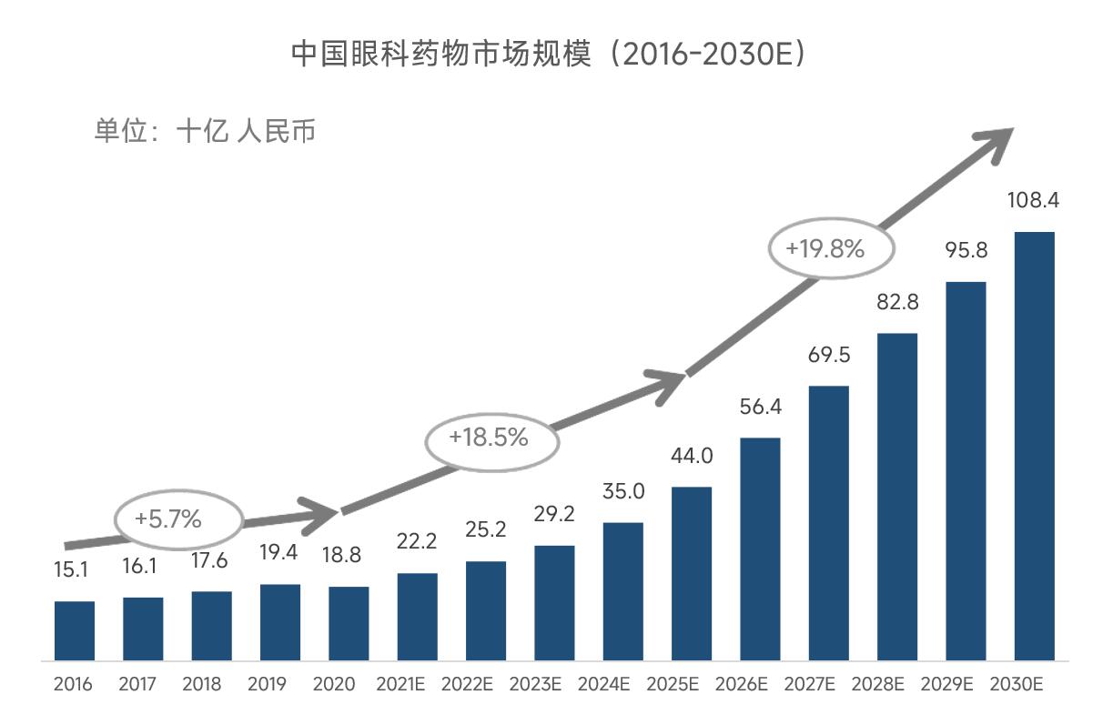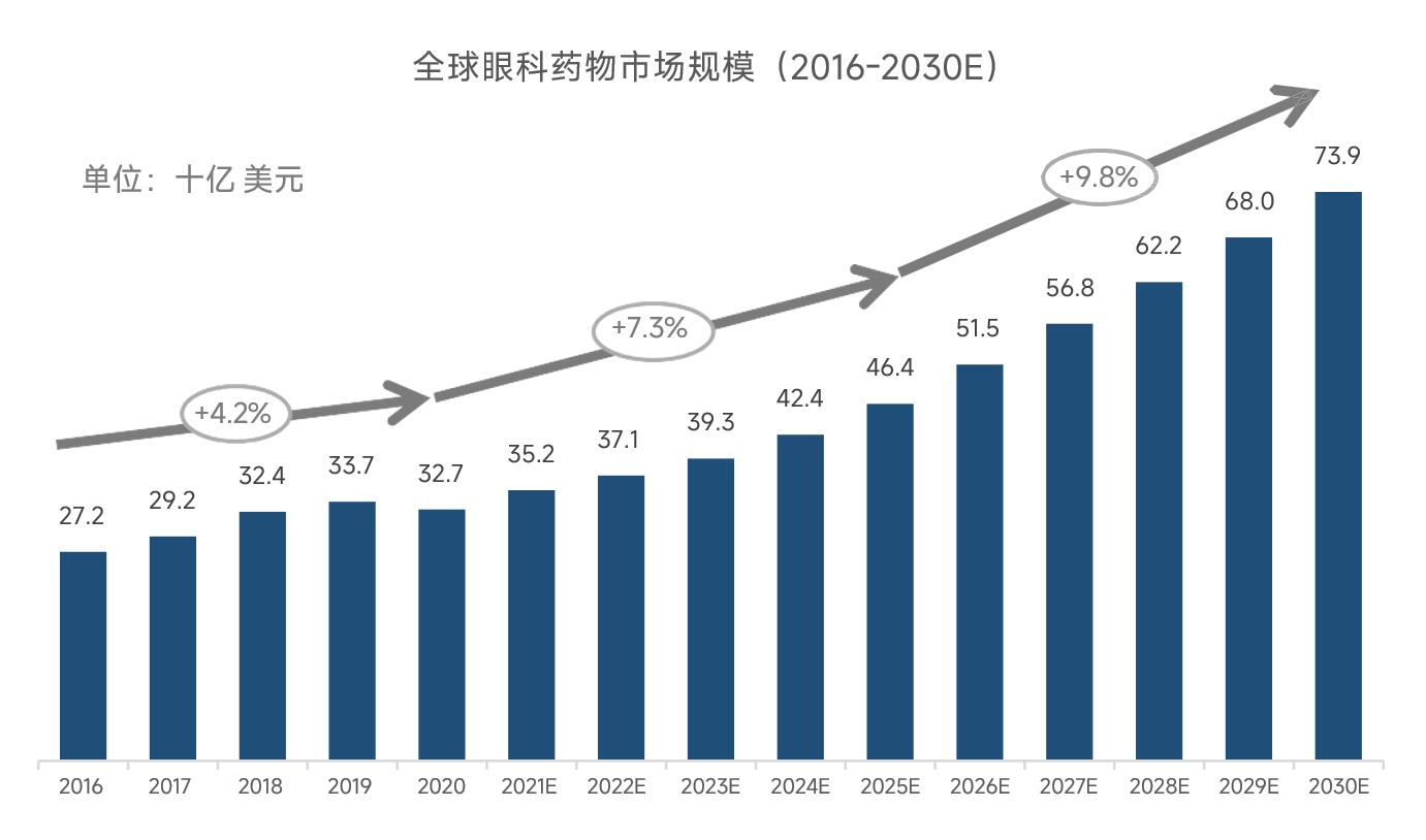 目前,全球眼科市場整體呈現出穩定增長、集中度較高的特點。2016年至2020 年,全球眼科藥物市場規模從277億美元增長至327億美元,復合年增長率為 4.2%。隨著未來更多眼科創新藥物的研發和上市,預計2025年將達到464億美元,2030年將達到739億美元。2016-2020年中國眼科藥物市場規模從151億增長至188億元,復合年增長率達5.7%,預計2025年將達到440億元,2030年將達到1084億元。預計未來,中國將以超過全球2倍的平均增長率快速增長,發展勢頭強勁。