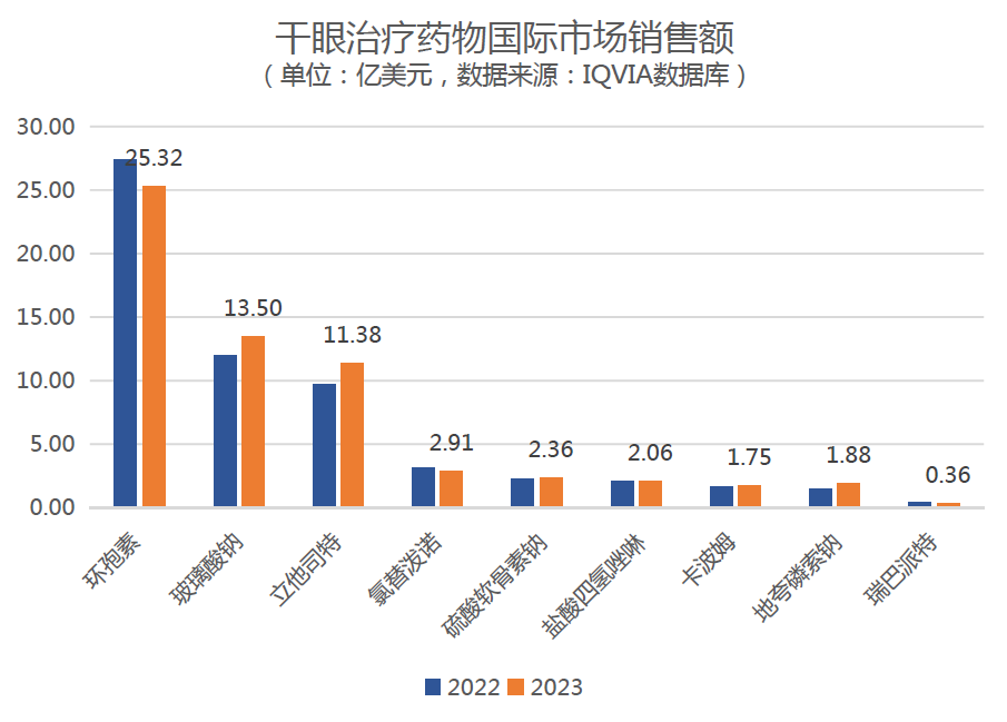 2023年,國際市場干眼癥的銷售額最高的產品變化不大,主要有環孢素(25.32億)、玻璃酸鈉(13.50億)、立他司特(11.38億)和氯替潑諾(2.91億)。從增長情況來看,增長率最快的產品分別為立他司特(+16.7%)、玻璃酸鈉(13.0%)和地夸磷索鈉(+29.7%)。